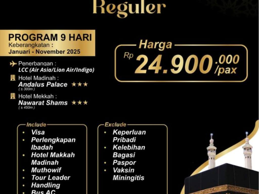 - Perlengkapan : Hand Bag Travel, koper, bagasi, kain ihram/mukena, buku manasik, syal, dan manasik umrah