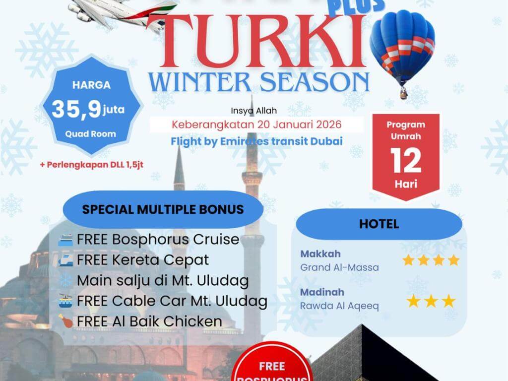 - Perlengkapan : Hand Bag Travel, koper, bagasi, kain ihram/mukena, buku manasik, syal, dan manasik umrah